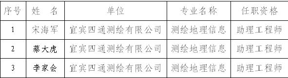 经本人申请、单位推荐、市职改办委托,四川省测绘地理信息中级专业技术职务任职资格评审委员会于2017年12月21日评审,拟同意宋海军等3人初级职务任职资格(名单附后),现予公示。公示时间从2018年1月12日起,公示期7日(法定节假日和公休日顺延)。公示期内,任何单位和个人对公示人员身份、经历、业绩、成果等有异议的,可通过来信、来电、来访如实反映。以组织名义反映的,必须经集体研究,主要领导签发,并加盖公章;以个人名义反映的,应署(报)真实姓名、工作单位和联系电话、通讯地址等,不署(报)真实姓名和联系方式的,不予受理。公示情况反映受理部门:宜宾市职称改革工作领导小组办公室;受理时间:工作日9:00—12:00、14:00——18:00;受理地点:宜宾市南岸长江大道西段13号www.288-365.com8楼810室;联系电话:5103456,5103481;邮政编码:644000。
