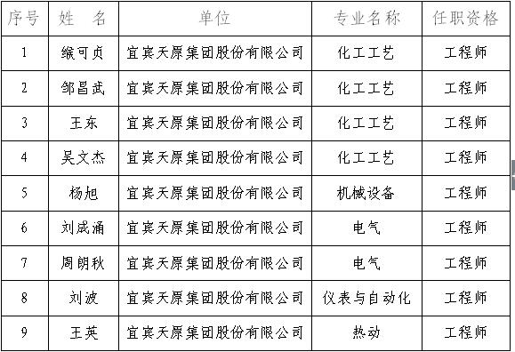 经本人申请、单位推荐,宜宾天原股份有限公司工程中级专业技术职务评审委员会于2017年12月14日评审,拟同意缑可贞等9人中级职务任职资格(名单附后),现予公示。公示时间从2018年1月9日起,公示期7日(法定节假日和公休日顺延)。公示期内,任何单位和个人对公示人员身份、经历、业绩、成果等有异议的,可通过来信、来电、来访如实反映。以组织名义反映的,必须经集体研究,主要领导签发,并加盖公章;以个人名义反映的,应署(报)真实姓名、工作单位和联系电话、通讯地址等,不署(报)真实姓名和联系方式的,不予受理。公示情况反映受理部门:宜宾市职称改革工作领导小组办公室;受理时间:工作日9:00—12:00、14:00——18:00;受理地点:宜宾市南岸长江大道西段13号www.288-365.com8楼810室;联系电话:5103456,5103481;邮政编码:644000。