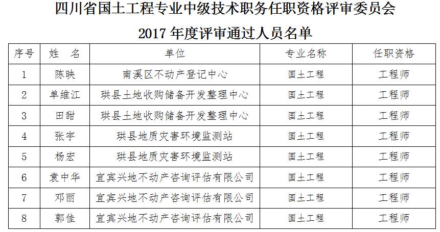 经本人申请、单位推荐、市职改办委托,四川省国土工程专业中级技术职务任职资格评审委员会于2018年4月29日评审,拟同意陈映等8人中级职务任职资格(名单附后),现予公示。公示时间从2018年6月1日起,公示期7日(法定节假日和公休日顺延)。公示期内,任何单位和个人对公示人员身份、经历、业绩、成果等有异议的,可通过来信、来电、来访如实反映。以组织名义反映的,必须经集体研究,主要领导签发,并加盖公章;以个人名义反映的,应署(报)真实姓名、工作单位和联系电话、通讯地址等,不署(报)真实姓名和联系方式的,不予受理。公示情况反映受理部门:宜宾市职称改革工作领导小组办公室;受理时间:工作日9:00—12:00、14:00——18:00;受理地点:宜宾市南岸长江大道西段9号www.288-365.com8楼810室;联系电话:5103456,5103481;邮政编码:644000。